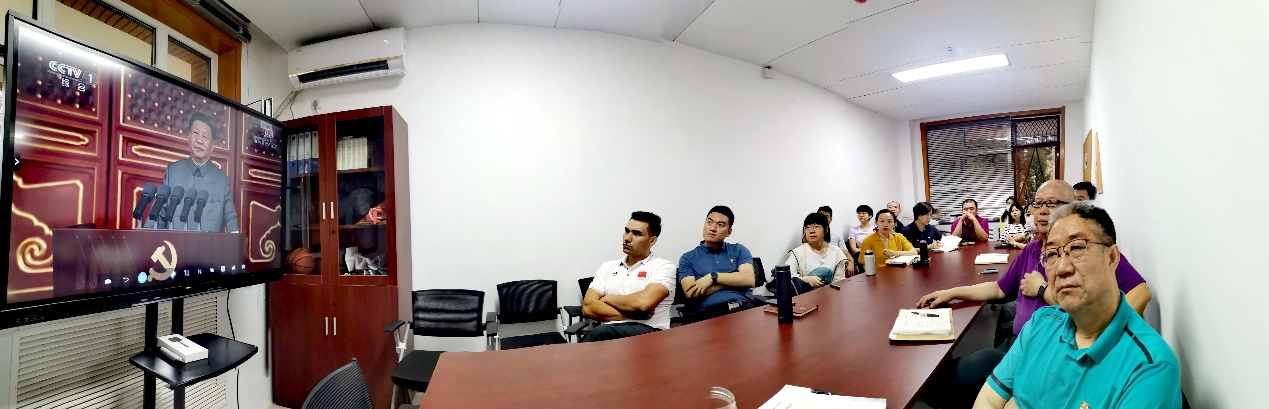 2021年7月1日上午8时,雷竞技raybet登录入口(体育师范学院)分党委理论学习中心组(扩大)会在104会议室召开,集中收听收看庆祝中国共产党成立100周年大会实况。分党委理论学习中心组全体在校成员、教师党支部委员、全体辅导员和学院办公室工作人员参加了会议。会议由分党委书记李少雄主持。学院另有15名老师和学生作为学校的代表亲临天安门广场参加庆典大会。