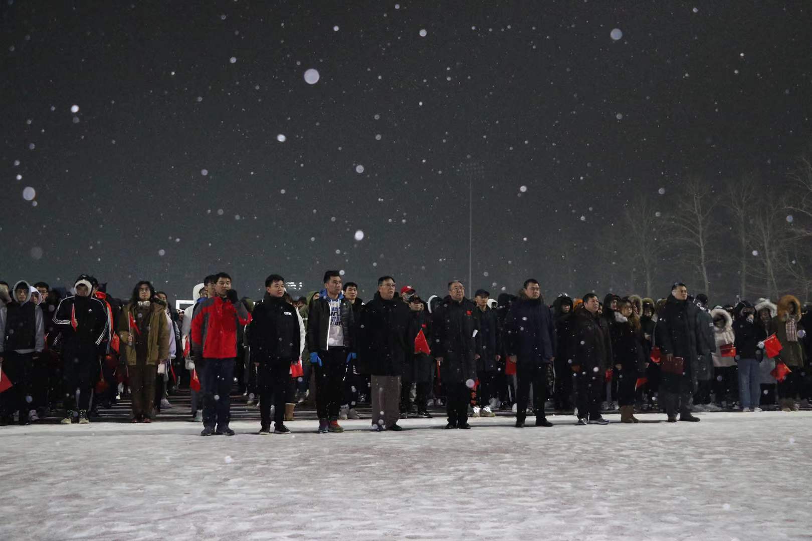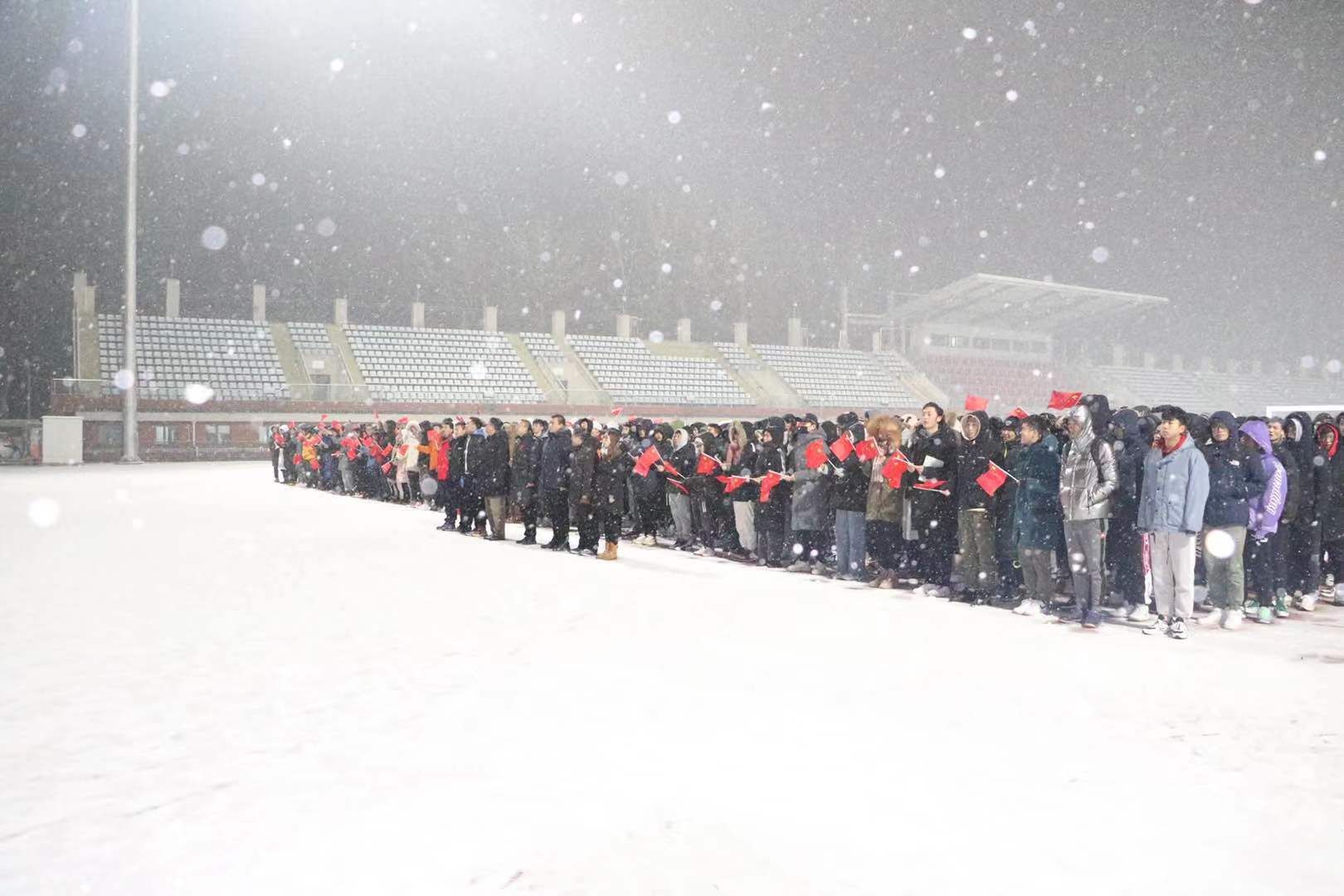 迎着飞舞的雪花,升国旗仪式正式开始。雷竞技raybet登录入口国旗护卫队的队员们迈着坚定的步伐缓缓步入英东体育场。紧接着,升旗手迎风振臂,全体师生注视着五星红旗冉冉升起,一同高唱国歌,鲜艳的五星红旗迎风飘扬,在漫天雪花中格外鲜艳。