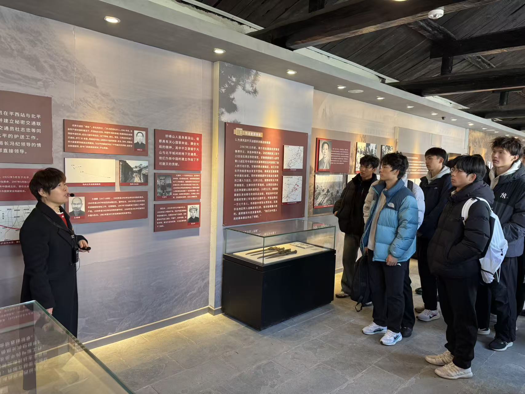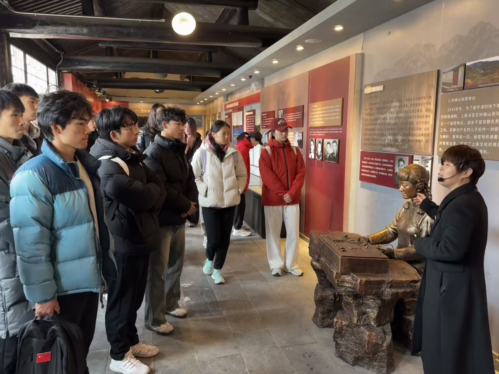 随后参观了平西情报联络站纪念馆。平西情报联络站始建于抗日战争时期,是连接北平与抗日根据地的重要秘密通道,曾传递了大量重要情报,为平西抗日根据地的巩固和发展作出了重大贡献。同学们在陈列的文物与史料面前认真聆听,深入了解了革命战争时期情报工作的艰险与智慧。