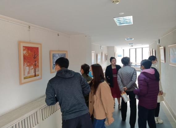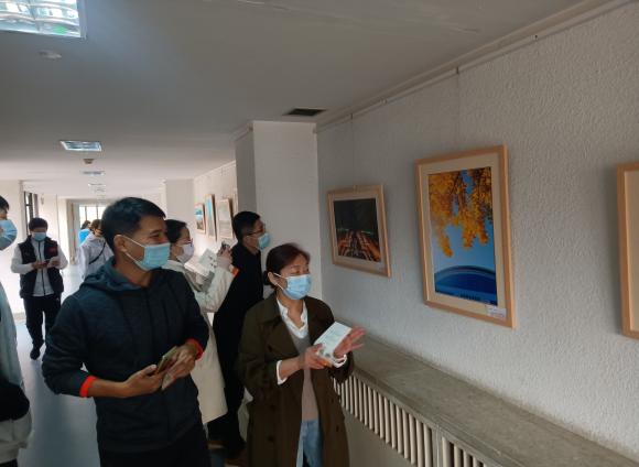 在展馆内,全体教职工认真观赏书画、摄影作品,在志愿者的解说下认真体会书画、摄影作品所蕴含的意义,大家不时停下脚步交流探讨,感受北体人对奋进新征程的自信,深刻领悟到北体人对“使命在肩,奋斗有我”精神的坚守。