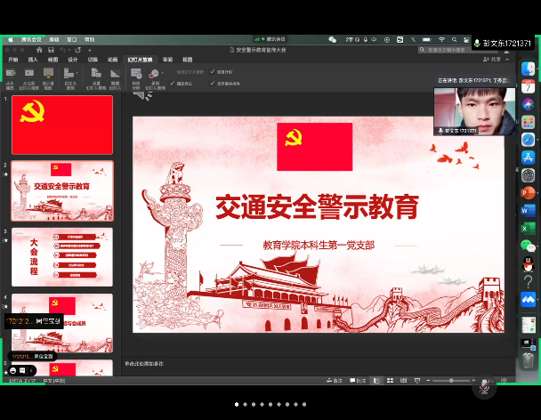 2020年12月07日中午12:30,学院本科生第一党支部在腾讯会议线上召开了党员交通安全警示教育。大会由程祎同志主持,参加此次会议的还有学院院长王华倬、本科生第一党支部书记丁冬云、学院教务员赵娜以及50名党员和21名预备党员学生。