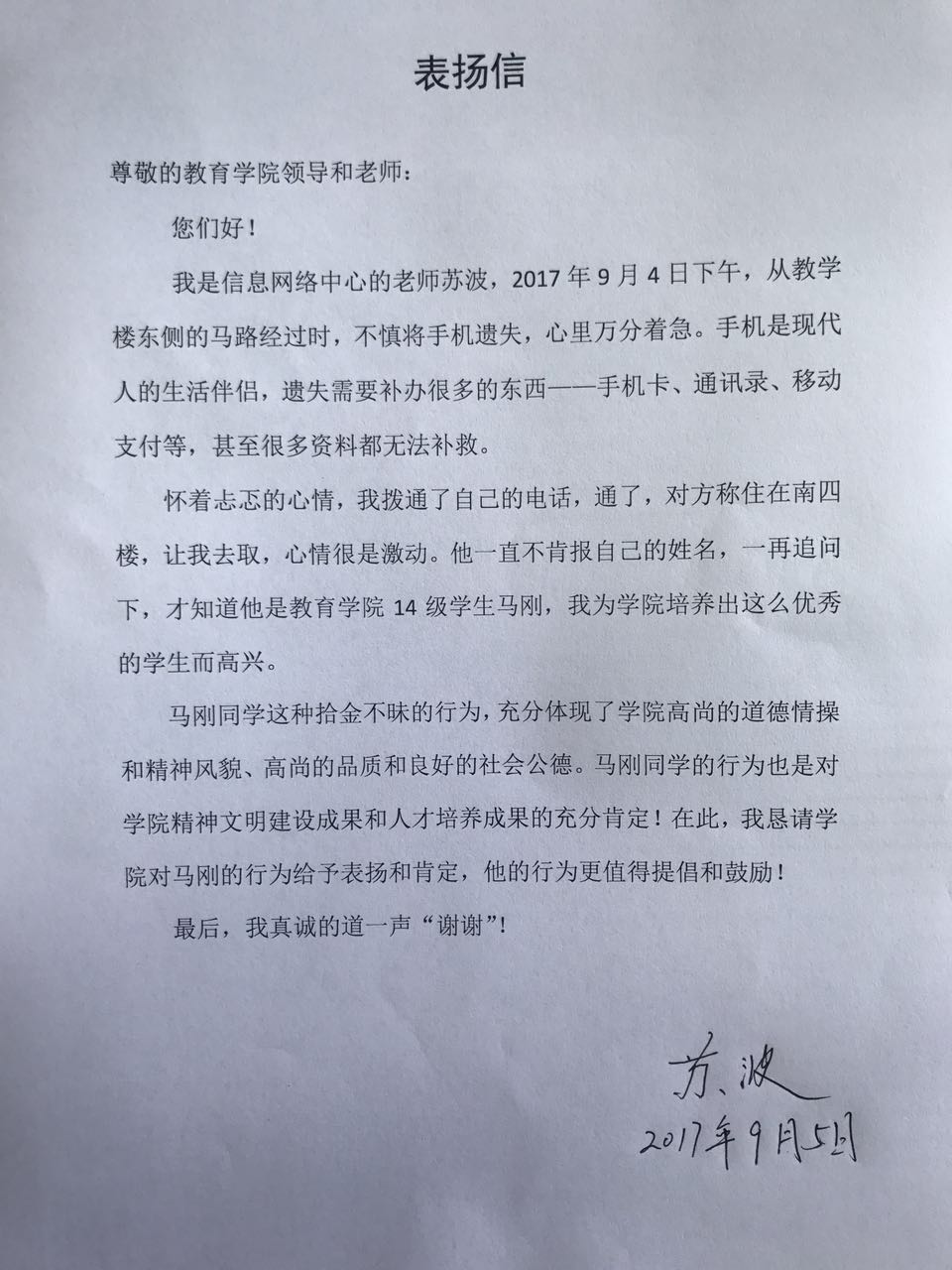 为感谢我院2014级学生马刚,信息网络中心苏波老师于2017年9月6日上午特意送来表扬信。