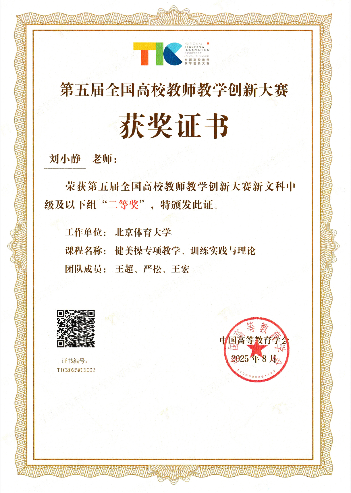 第五届全国高校教师教学创新大赛全国现场赛于8月19日在北京理工大学落下帷幕。我院青年刘小静博士代表北京赛区参赛,主讲课程“健美操专项教学、训练实践与理论”在588个参赛作品中再创佳绩,获得新文科中级及以下组二等奖。为学校继省赛取得最佳成绩后,实现了在全国赛最高级别奖项的新突破。